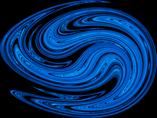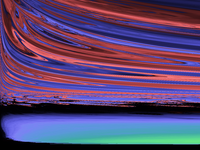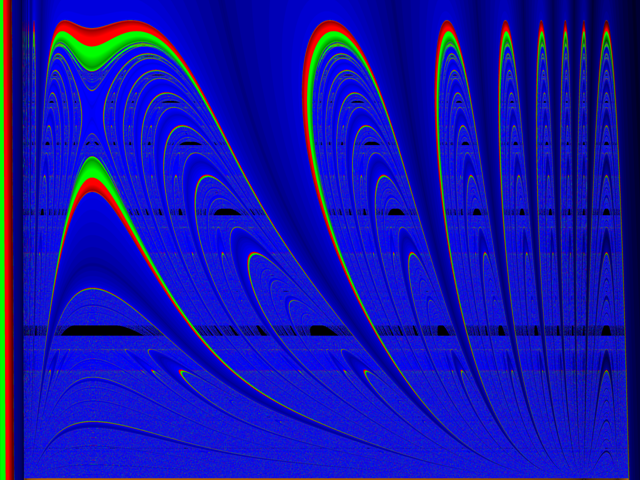 Tři barvy (červená, zelená a modrá) zastupují počáteční podmínky vedoucí ke třem různým pokritickým řešením. Černá barva zastupuje počáteční podmínky, při kterých Newtonova metoda osciluje a proto selže při použití pro nalezení řešení. Průhyb na vodorovné ose, velikost zatěžující síly na svislé ose.