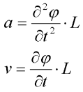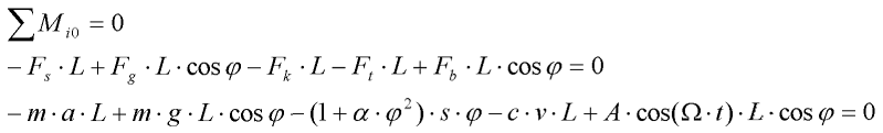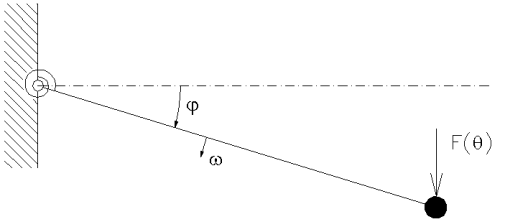 ![]() | Model konstrukce se znázorněnými stavovými proměnnými. Úhlová výchylka měřená od horizontální osy (stavu, kdy je konstrukce nezatížená), úhlová rychlost , jejíž funkce je derivací funkce úhlové výchylky. Fáze budící síly .