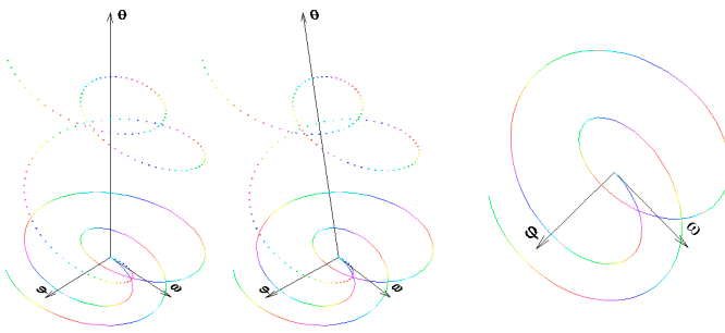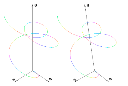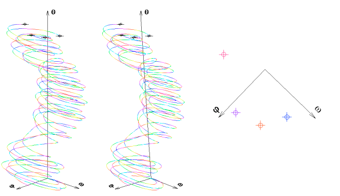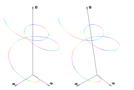 ![]() | Druhý z obrázků. Anaglyf téže trajektorie. Oproti předchozímu obrázku přibývají stavové proměnné a . Časová osa se ztratila. Je však stále nepřímo přítomna jako lineární transformace osy stavové proměnné . Předchozí obrázek je vlastně lineárně transformovanou projekcí této trajektorie do roviny ![]() . |