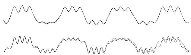 Obr.: Znázornění vlivu počátečních podmínek. V horní i dolní části je dvojice trajektorií pro mírně odlišné počáteční podmínky. Horní dvojice je stabilním chováním, je patrno že odlišnost počátečních podmínek nemá velký vliv. U dolní dvojice je v pravé části patrno, že rozdíl v počátečních podmínkách způsobil výrazně odlišnou odezvu systému. Zcela zřejmě tedy jde o nestabilní chování.
