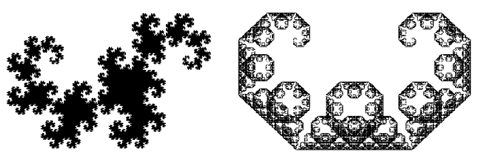 Obr.: Obrázek dvou fraktálů. Levý fraktál se nazývá dračí křivka a pravý C křivka. Oba vznikají jednoduchým iteračním výpočtem, kdy se nad odvěsnami pravoúhlého rovnoramenného trojúhelníka konstruují nové trojúhelníky stejného druhu, ovšem jejich přepony jsou odvěsnami původního trojúhelníka. Rozdíl obou fraktálů je dán polohou vytváření nových trojúhelníků. Z obrázku je patrno, že jednotlivé útvary se skládají ze zmenšených obdob těchto útvarů.