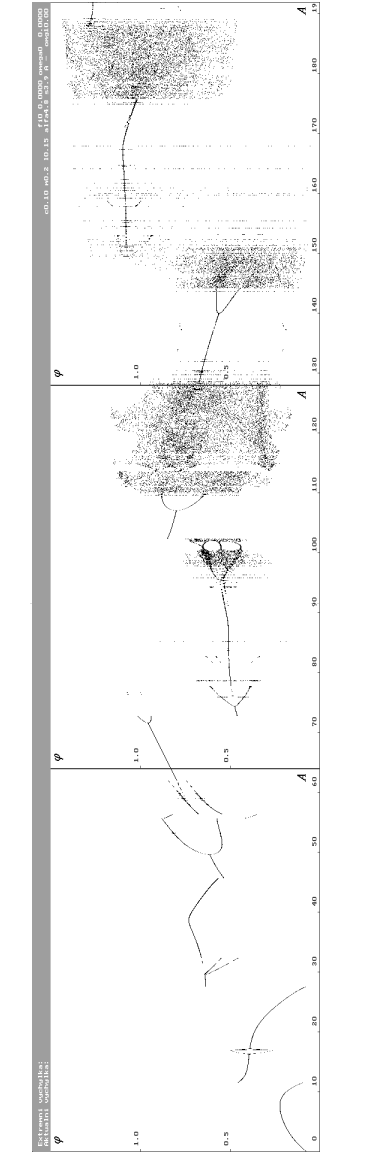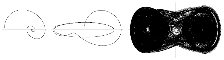 Obr.: Trojice projekcí trajektorie do roviny. Jednotlivé projekce ukazují, do jakého limitního cyklu systém dospěl. V levém případě je patrné přibližování se k limitnímu bodu. Uprostřed je limitním cyklem elipsa a vpravo je projekcí nepříliš názorně zobrazen podivný atraktor