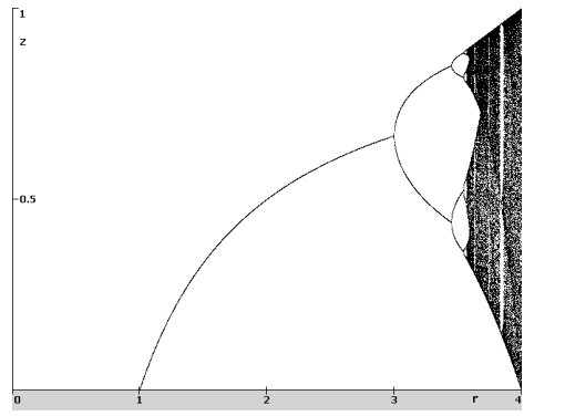 ![]() | Bifurkační diagram diskrétního systému, používaného v biologii [3]. Je tvořen jednoduchou iterační rovnicí zi+1=zir(1-zi). Kde r je parametr nazvaný růstový faktor a z je stavová proměnná nazvaná populace. Pro zvolený růstový faktor je pro nějakou počáteční hodnotu populace z intervalu (0;1) proveden iterační proces. Je-li tento proces ukončen, vynese se několik po sobě jdoucích populací do grafu. Z grafu je zřejmé, že pro hodnotu r v intervalu (1;3) se systém ustálil do jediné hodnoty populace. Při hodnotě tři začnou populace oscilovat mezi dvěmi hodnotami. Dojde k rozdvojení (bifurkaci). Za určitou mezí se u systému nedá říci, že by se ustálil do konečného počtu populací. Dostáváme se do oblasti chaotického chování. Avšak i dále se dají nalézt stabilní oblasti, v nichž systém není chaotický. |
