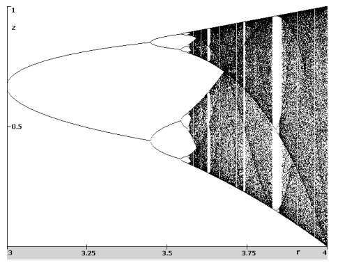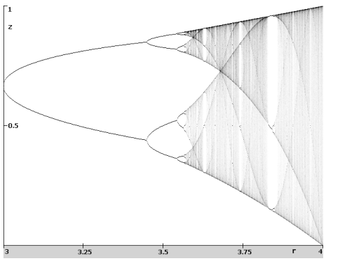 ![]() | Zvětšení části bifurkačního diagramu z předchozího obrázku. Jsou zde vidět stabilní oblasti střídající se s oblastmi chaosu. Také je z obrázku patrno, že v oblastech chaotického chování existuje jistý řád. Populace se soustředí kolem určitých hodnot. |