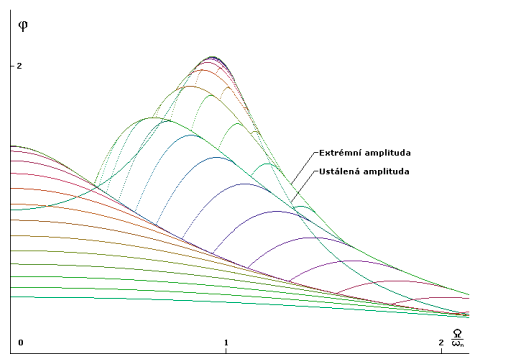![]() | Průběh aproximací funkce frekvenční odezvy lineárního tlumeného oscilátoru s koeficientem poměrného útlumu 0.25. Počáteční podmínky jsou nulové a budící funkce je kosinová. Barvy jsou použity pro rozlišení jednotlivých aproximací. Na obrázku jsou dvě výsledné křivky. Křivka extrémní amplitudy, tvořená nejpřesnější aproximací a křivka ustálené amplitudy, která je vykreslena na základě odvozeného vztahu. Z obrázku je dobře patrno, že nejvíce iterací si vyžádá oblast rezonance. Také lze rozpoznat, že vrchol rezonance je vlivem tlumení posunut od hodnoty jedna vlevo. Z obrázku lze vyvodit jednoduchý závěr, že pro nižší napjatost pružiny oscilátoru je výhodnější budící frekvence větší než vlastní frekvence oscilátoru . |