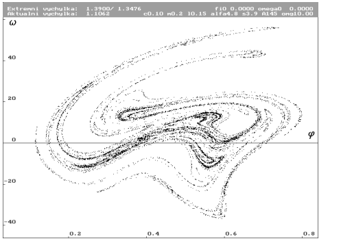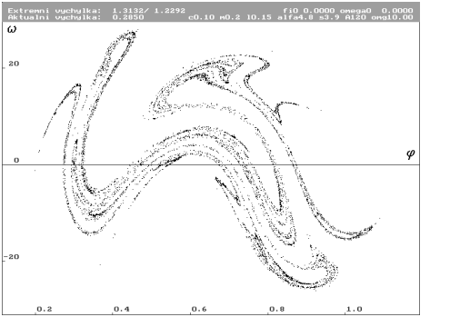V našem případě trajektorie systému není uzavřena v prostorově omezeném útvaru a její řez rovinou je buď pouhým bodem, nebo s časem se rozšiřující skupinou bodů. Proto nepovedeme řez jednoduchou rovinou, ale periodicky se opakující rovinou. Rovina bude vždy kolmá na stavovou proměnnou fáze budící síly. Perioda opakování řezu bude 2