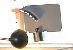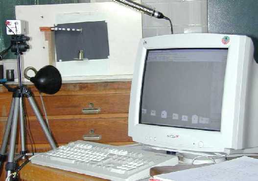 Obrázek ze statického měření průhybu konzoly z pružinové oceli. Konzola se záměrnými body je vzadu. Měřící aparatura v popředí.