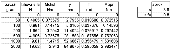 Tabulka naměřených hodnot, jejich přepočet a hodnoty aproximace.