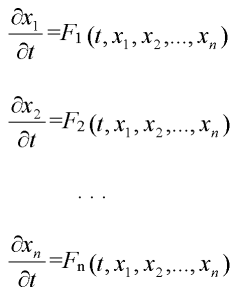 Je-li x uspořádaná množina (vektor) stavových proměnných ve fázovém prostoru R(n): (x1, x2, ..., xn) nazveme modelem dynamického systému soustavu diferenciálních rovnic: