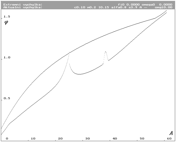 v závislosti na změně parametru amplitudy budící síly A. Jsou na něm vidět dvě zvláštní oblasti. Obě oblasti jsou oblastmi nestability systému. Je zde vidět, že obě oblasti jsou oblastmi rezonance.