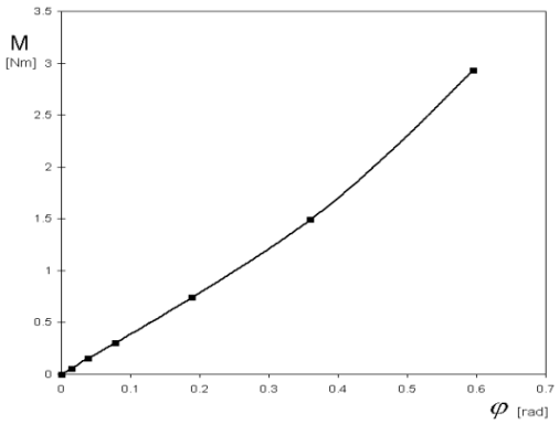 Konstrukce, která je modelována, byla sestrojena a staticky zatěžována. Nosník byl z ploché pružinové oceli, schopné velkých pružných deformací. Byla zjištěna nelineární závislost momentu ve vetknutí M na pootočení j koncového bodu, viz obr. 2. Tato vlastnost je v modelu zohledněna pomocí aproximace naměřených hodnot neúplným polynomem třetího stupně s nenulovým lineárním a kubickým členem, viz obr. 1 (jsou vybrány tyto dva členy, protože pouze tak je funkce symetrická k počátku, což nám zajišťuje nezávislost na směru zatěžování).