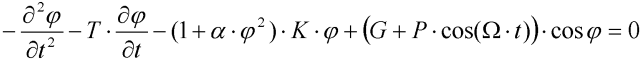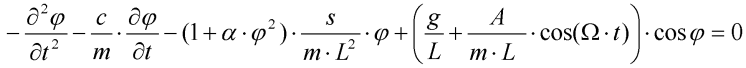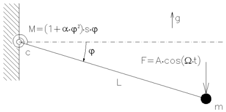 nelineární koeficient, s lineární tuhost pružiny, c konstanta útlumu, L délka závěsného prutu, m hmotnost hmotného bodu, g tíhové zrychlení, A amplituda budící síly,