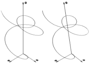Řešením je ve fázovém prostoru tzv. trajektorie systému viz obr. 4 (v anaglyfové podobě).