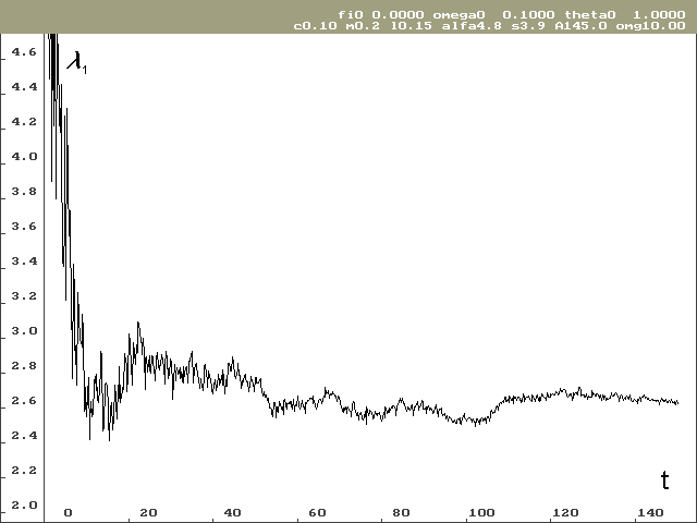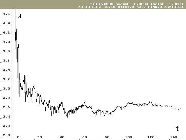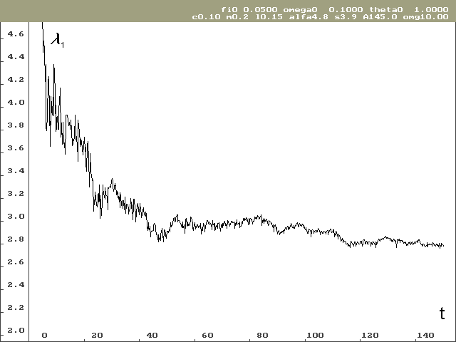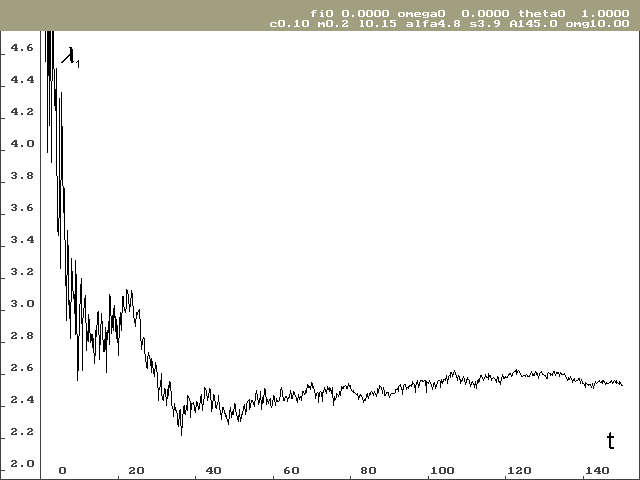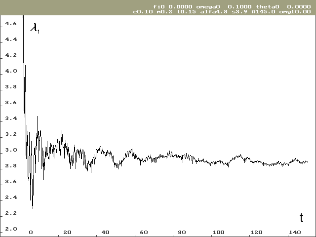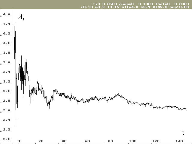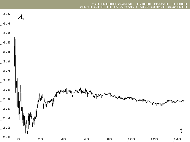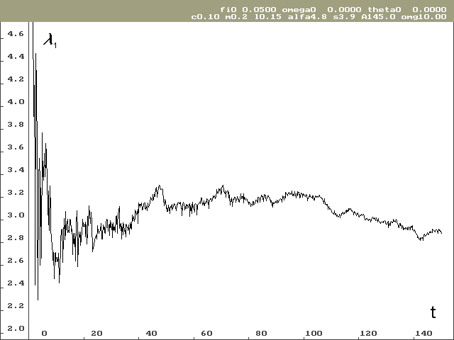 Vývoj lokálního Ljapunovova exponentu, který odpovídá ose stavové proměnné j pro nulové počáteční podmínky, je vidět na obrázku 2. Na obrázku 3 je vývoj Ljapunovova exponentu odpovídajícího ose stavové proměnné w, taktéž pro nulové počáteční podmínky. Hodnota lokálního Ljapunovova exponentu odpovídající ose stavové proměnné q je předem známá a výpočet tuto hodnotu potvrzuje.