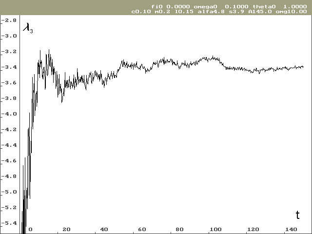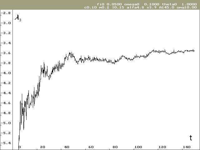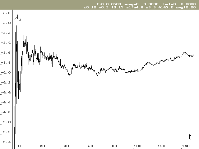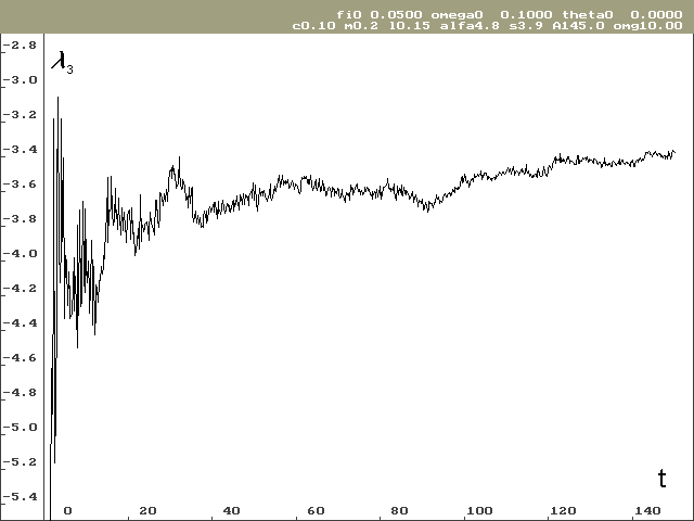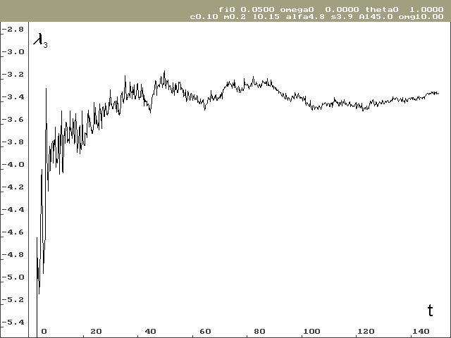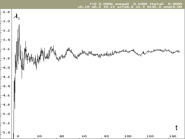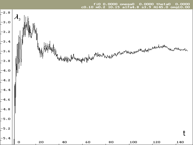 Pro stanovení Ljapunovova spektra bylo potřeba provést výpočty pro různé počáteční podmínky. Odhad globálních Ljapunovových exponentů vyšel značně rozdílný i pro poměrně dlouhé časové období (ve svých výpočtech jsem sledoval časové období od 0 do 150 sekund při kroku h = 0.0001s), viz tab. 1. Další komplikací při odhadování globálních Ljapunovových exponentů je, že závislost není taková, aby se dala snadno aproximovat funkcí s asymptotickým chováním. V průběhu Ljapunovových exponentů jsou totiž globální oscilace, jak je vidět na obrázcích 2 a 3. Proto byl odhad proveden prostým aritmetickým průměrem z poslední jedné čtvrtiny řešení (čas 112 až 150 sekund).