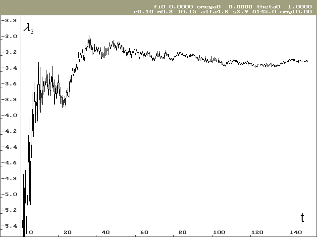Obr. 3: Závislost Ljapunovova exponentu l 3 na čase pro nulové počáteční podmínky. Odhadovaná hodnota je -3.51 bit.s-1.