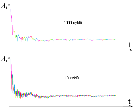 Obr. 4: Porovnání vlivu počtu cyklů na průběh Ljapunovova exponentu l 1.