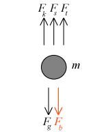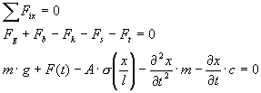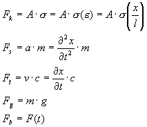Síla Fk odpovídá působení pružiny, síla Fs odpovídá setrvačné síle, síla Ft tlumící síle, Fg je tíhová síla a Fb je budící síla odpovídající zatížení. Tyto síly lze rozepsat: