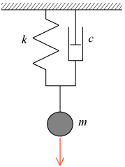Konstrukci na obr. 1 nahradíme modelem s jedním stupněm volnosti, jenž je schematicky znázorněn na obr. 2. Na obrázku 2 jsou zobrazeny tři parametry, z nichž každý odpovídá modelovému zjednodušení některé vlastnosti. Parametr m bude náhradní hmotnost hmotného bodu odpovídající kmitající hmotě. Zvolíme jej pro jednoduchost tak, že bude roven hmotnosti celého prutu. Parametr k je tuhost pružiny odpovídající tuhosti prutu v tahu. Jelikož budeme uvažovat nelineární plastické chování betonu, nebude tato tuhost konstantní. Parametr c je konstanta útlumu, který bude zajišťovat ztrátu energie vlivem jejího rozptýlení způsobeného třením, odporem vzduchu apod. Útlum budeme uvažovat lineární. Dále si rozebereme sestavení jednotlivých vztahů, které potřebujeme pro vytvoření dynamického systému.
