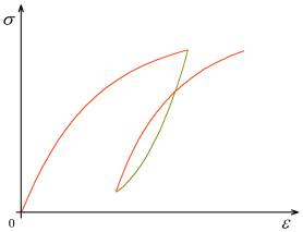 Chování betonu pod zatížením je složité. Deformace roste s napětím nelineárně a poklesne-li napětí, pak deformace neklesá stejným způsobem jako stoupala (viz obr. 4: červená je zvyšování napětí, zelená je snižování napětí). Vznikají trvalé deformace. Takové chování popisujeme jako plasticitu.
