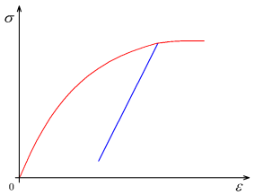 Pro tuto práci byl pracovní diagram zjednodušen, protože definice funkcí zajišťujících kompletní popis diagramu je složitá. Zjednodušení je takové, že nelineární zůstává pouze ohraničující funkce, která je funkcí, jež by byla správná, kdyby napětí neklesalo. V případě, že napětí poklesne, pak klesá i následně stoupá lineárně až po průsečík s ohraničující funkcí. Takový pracovní diagram je znázorněn na obrázku 5 (červená je zvyšování napětí na ohraničující funkci, modrá je snižování a zvyšování napětí pod ohraničující funkcí).
