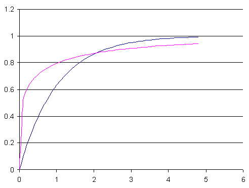 Na obrázku 6 je srovnání obou funkcí, přičemž parametry b = 2.7172 a a = 1. Je vidět, že normová funkce má nekonečnou hodnotu derivace v počátku a její hodnota pro 28 dní rozhodně není 0.5, což by odpovídalo poločasu smršťování.