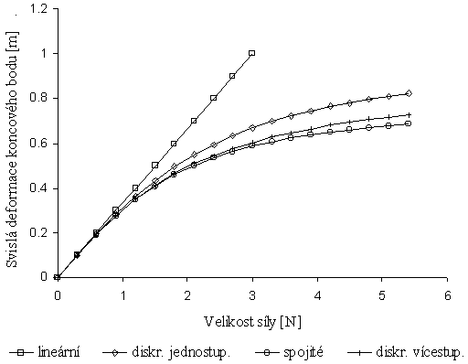 Obdobně jako u rovnice (16) je hodnota y1 hledanou svislou deformací a také pro sílu F=0 je hodnota y1=0. Diskrétní vícestupňová řešení obou zmíněných metod se shodují natolik (rozdíl maximálně 0.1%), že není třeba uvádět obojí. Tato řešení souhrnně popíšeme jako diskrétní vícestupňová. Z úsporných důvodů si ukážeme grafy všech vybraných řešení pouze pro koncovou svislou deformaci konzoly v závislosti na velikosti síly F. Grafy jsou společně zobrazeny na obr. 2.