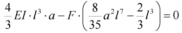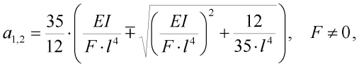 kde kořen a1 je parametr hledaného prvního stabilního řešení (uvádíme zde přívlastek "první stabilní", protože existuje nejméně jedno další stabilní řešení úlohy, nalezené pomocí metody [2]). Pro sílu F=0 je kořen a1 nulový. Kořen a2 je přiblížení k prvnímu nestabilnímu řešení úlohy (potenciální energie deformace systému zde nabývá svého lokálního maxima) a nebudeme se jím dále zabývat.