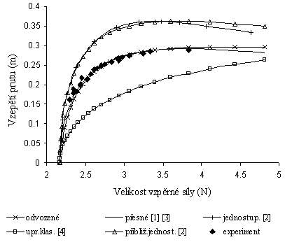 Podívejme se na graf závislostí vzepětí prutu na velikosti vzpěrné síly F (viz obr. 2) a také na deformované tvary odvozeného řešení, přesného řešení [3] a experimentu (viz obr. 3).