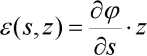 je poměrné přetvoření vláken ve vzdálenosti z od těžiště průřezu se souřadnicí s měřenou po střednici prutu od zvoleného počátku a