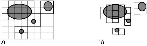 Obr. 1: Pokrytí objektu sítí (25 krychlí) - a) a optimalizovanou sítí (20 krychlí) - b)