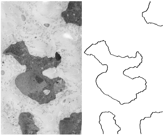 Obr. 2: Snímek barvené lomové plochy a zvýrazněná hranice
