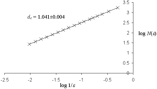 Obr. 3: Graf naměřeného bodového pole, jeho aproximace a odhad kapacitní dimenze