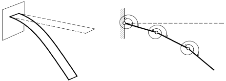 je vzájemné pootočení tuhých dílců resp. dvojnásobek pootočení dílce u vetknutí (lze si představit, že vetknutí je uplatnění svislé osy symetrie na volném nosníku délky 2lc), k je tuhost rotační pružiny, l je délka tuhého dílce a n je počet tuhých dílců. Doplňme, že hmotnost jednoho tuhého dílce m je rovna mc / n.