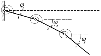 Mějme model konzolového nosníku složený ze tří dílců (získaný vztah lze potom snadno zobecnit), jak je znázorněno na obr. 2. Dílce jsou stejně dlouhé a pružiny mají stejnou tuhost, viz vztah (1). Pro takto vytvořený model sestavme pohybové rovnice dle Lagrangeovy metody [2].