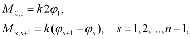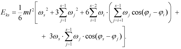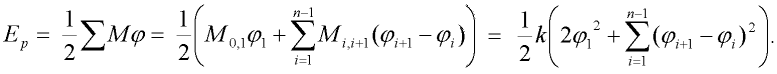 Potenciální energii Ep obdržíme snadněji. Jedinými akumulátory potenciální energie jsou rotační pružiny. Označme pružinu indexem s,s+1 pokud připojuje s-tý tuhý dílec k s+1 dílci. Potom pro napjatost této pružiny platí (sledujme obr. 2):