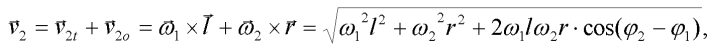 Pro druhý dílec je situace složitější. Pohyb diferenciálního elementu na druhém dílci lze psát jako součet dvou nezávislých pohybů: pohybu translačního o translační rychlosti rovné obvodové rychlosti koncového bodu prvního dílce a pohybu rotačního o úhlové rychlosti