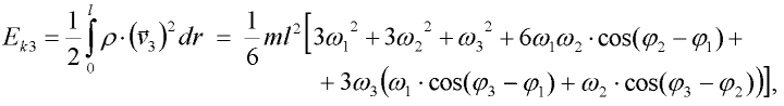 Obdobně jako pro druhý dílec, lze pro kinetickou energii třetího dílce ze součtu vektorů dílčích rychlostí odvodit vztah: