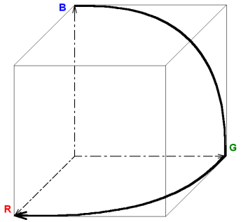 Jednoduchou barevnou stupnici s dlouhou trajektorií můžeme vytvořit tak, že povedeme úsečku z červeného vrcholu do zeleného vrcholu a dále ze zeleného vrcholu do modrého vrcholu, viz obr. 6. Délka trajektorie tak bude činit přibližně 2.83.