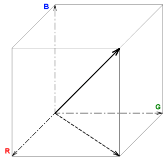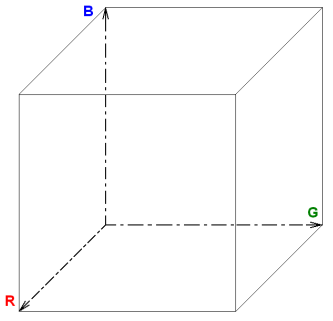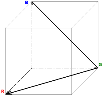 Uvažujme standardní Red-Green-Blue (červená-zelená-modrá) barevný model. Každá barva je v něm jednoznačně dána třemi hodnotami -- základními složkami -- červenou, zelenou a modrou. Tento model lze interpretovat jako omezený prostor se třemi rozměry, které odpovídají složkám barvy. Každý bod v tomto prostoru je potom unikátní barvou. Každá ze tří složek barvy nechť je reálné číslo z intervalu <0,1>. RGB prostor je potom krychle o jednotkové straně, viz obr. 1.