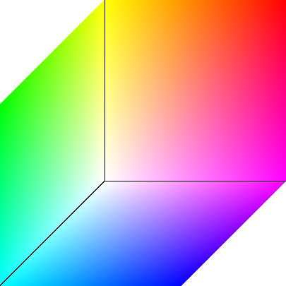 Pro tento barevný model platí, že hodnota složky barvy je úměrná jasu složky barvy, tj. barva {0,0,0} je černá a barva {1,1,1} je bílá. Pro lepší přiblížení k pochopení rozložení barev v tomto prostoru lze zobrazit např. barvy na podstavných plochách krychle. Toto zobrazení je vidět na obr. 2.