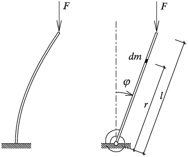 Mějme jednostranně vetknutý štíhlý prut zatížený ve vzpěru. Nahraďme jej absolutně tuhým segmentem, připojeným k vetknutí kloubem s rotační pružinou, viz obr. 3.