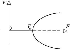 Na obr. 2 je zobrazen schematický graf příčného vybočení středního průřezu prutu (vzepětí), označeného symbolem w, v závislosti na velikosti vzpěrné síly F. Vidíme, že dosažením kritické síly dochází k nekonečně rychlému vzdalování dvou možných stabilních stavů. (Vzdálenost těchto stavů je úměrná , kde F=F-Fcr.) Přímý tvar prutu se stává nestabilním stavem. Tento typ vidličkové bifurkace má přívlastek superkritická.