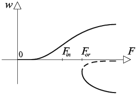 Druhým význačným bodem, který se limitně ztotožní s bifurkační hodnotou řídícího parametru, je místo zrodu dvojice větví. Označme hodnotu síly pro tento bod For, viz obr.3. Nachází-li se systém ve stavu odpovídajícímu stabilní větvi takto zrozené, pak při poklesu řídícího parametru dojde při dosažení místa zrodu ke katastrofě - tzv. tvrdé ztrátě stability. Systém přejde na stabilní větev "na straně imperfekce" a bez vnějšího zásahu se již do stavu na opačné straně nevrátí.