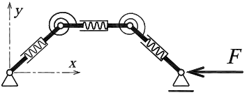 Model lze řešit například Newtonovou iterační metodou s užitím numerické derivace potenciální energie Ep. Dodejme, že obohacení modelu o zatížení a imperfekci (Imperfekce je v použitém modelu reprezentována pomocí síly působící uprostřed prutu ve směru osy y, viz obr. 4.)