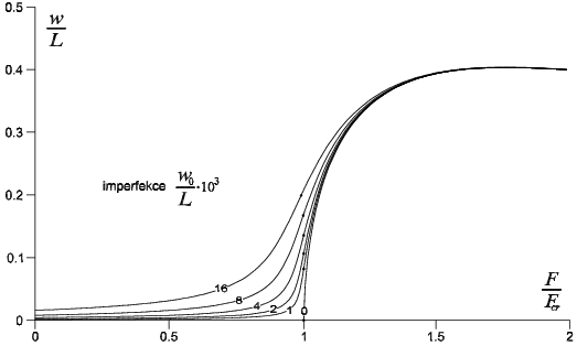 Na obr. 5 jsou vidět vypočtené závislosti vzepětí prutu w na vzpěrné síle F včetně vlivu imperfekce. Imperfekce je určena pomocí vzepětí prutu w0, který není zatížen vzpěrnou silou F. Jeho hodnota je v grafu uváděna bezrozměrně. Ržanicynovu přesnému řešení odpovídá funkce s nulovou velikostí imperfekce. Inflexní body funkcí, respektive extrémy první derivace funkcí, jsou zvýrazněny puntíky.