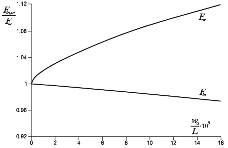 Nakolik je poloha inflexního bodu Fin a poloha zrodu dvojice větví For závislá na velikosti imperfekce, ukazuje obr. 6. Je vidět, že pro malé imperfekce je hodnota Fin prakticky shodná s hodnotou kritické síly. Z grafu je patrné, že se poloha inflexního bodu Fin jen málo liší od bifurkační hodnoty Fcr i při imperfekci odpovídající prohnutí prutu více než jeden a půl centimetru na délku jeden metr. Jinak je tomu u hodnoty For popisující polohu zrodu. Funkce For(w0) zřejmě nemá pro nulovou imperfekci derivaci.