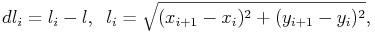 kde nl je počet liniových pružin, nf je počet rotačních pružin, kl je tuhost liniových pružin, kf je tuhost rotačních pružin, dli je protažení i-tého dílce a di je natočení rotační pružiny (vzájemné pootočení dílců, které pružina spojuje). Předpokládejme, že deformační stav modelu prutu jednoznačně určují polohy všech jeho kloubů. Nechť je poloha každého kloubu dána dvojicí souřadnic (xi,yi), kde i je index kloubu. Pro protažení liniové pružiny dli lze pak psát:
