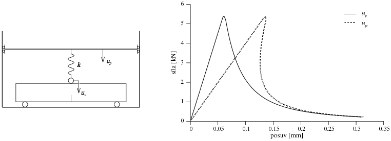 Zatěžování vnuceným posunem ovšem klade náročné požadavky na vlastnosti zatěžovací soupravy - lisu. Má-li zatěžování probíhat stabilně, je zapotřebí, aby lis absorboval co nejméně deformační energie, tj. musí mít dostatečnou tuhost. V případě, že lis není dostatečně tuhý, pak dochází ke kvalitativní změně zatěžovací dráhy nazývané snapback, viz např. [Bažant & Cedolin 1991]. Zatěžovací dráha se vlivem nízké tuhosti lisu deformuje a vzniká záhyb, viz obr. 1. Záhyb je v terminologii teorie katastrof [Arnold 1983] typická kubická singularita.
