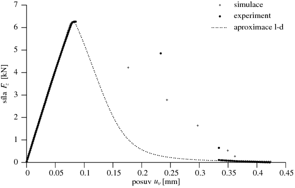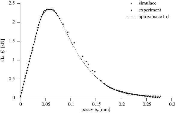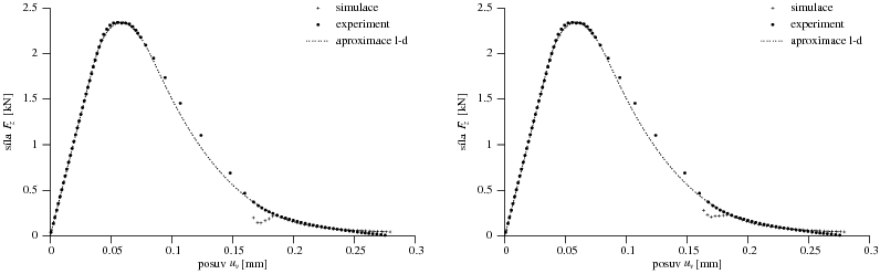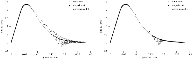 Na obr. 5 a 6 jsou vidět výsledné aproximace l-d diagramů obou vzorků včetně výsledku dynamické simulace s parametry: tuhost lisu kz = 21.5 kN.mm-1, rychlost zatěžování vz = 0.00126 mm.s-1 a koeficient útlumu